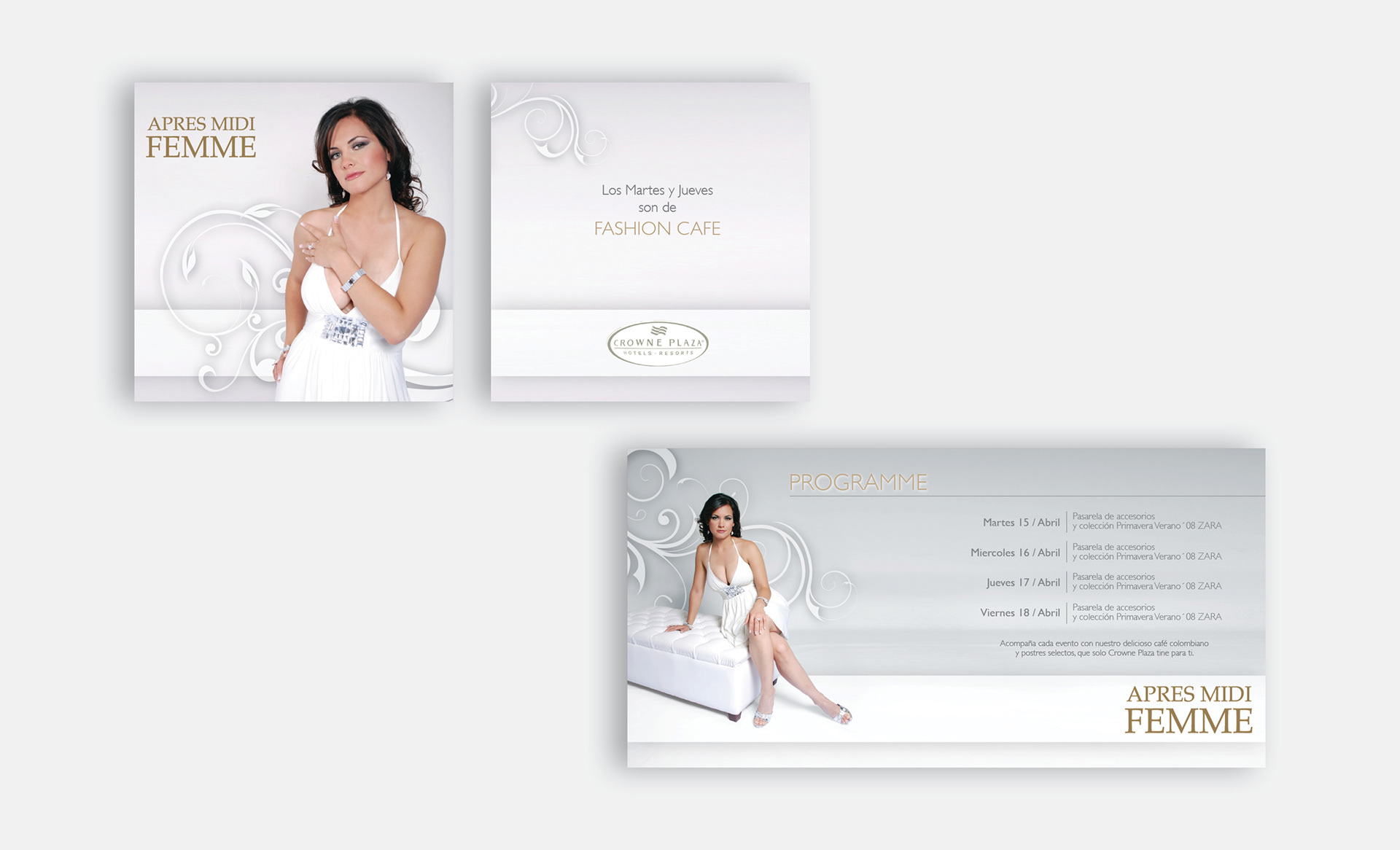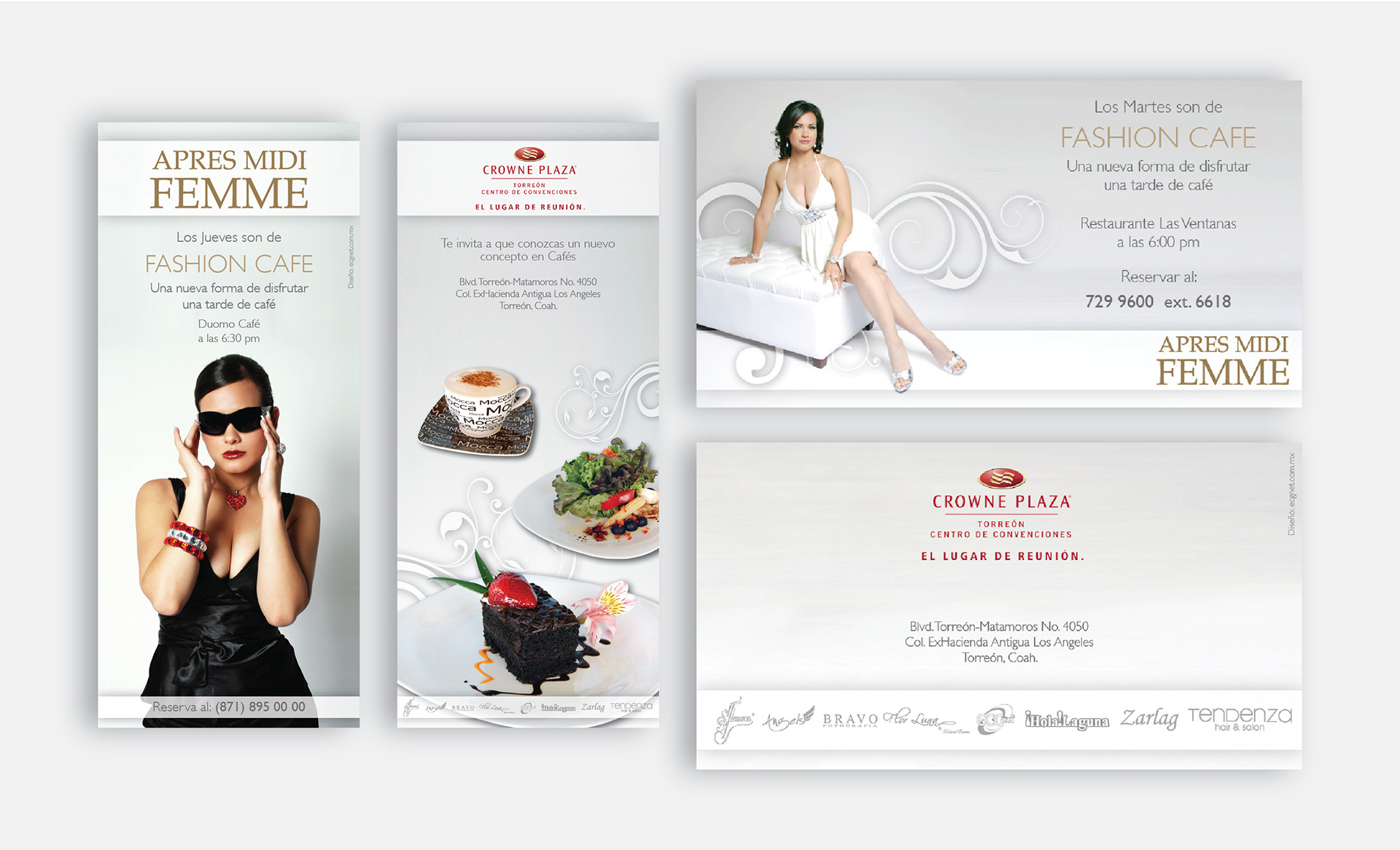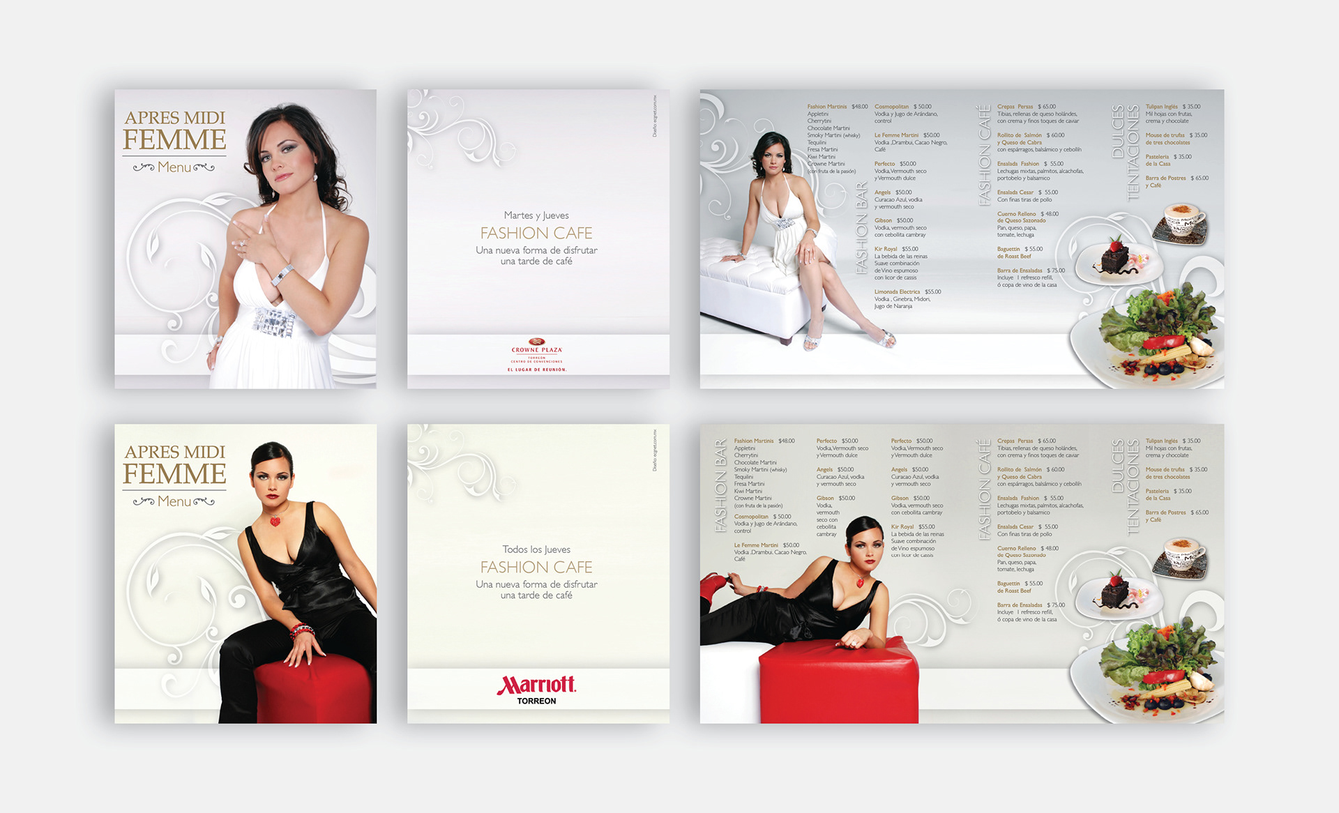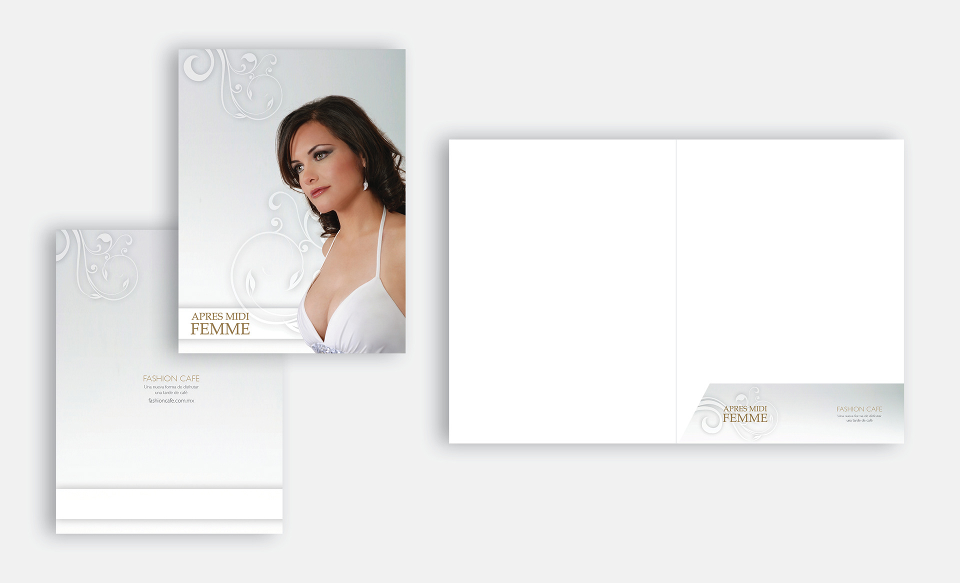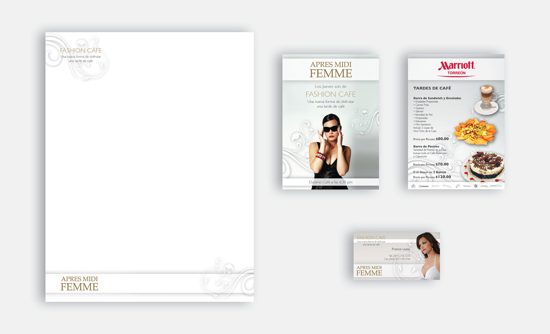 FASHION CAFE brought together two concepts: Afternoon coffee with friends and a fashion runway. Working with the local hotels, the event would offer a salad and dessert buffet with coffee and a fashion runway with the latest trends from the local clothing stores for one price. The concept was quite succesfull. Different menus, invitations and printed posters along with the usual stationary were made for each event, due to the change of location and the different sponsors for each runway.