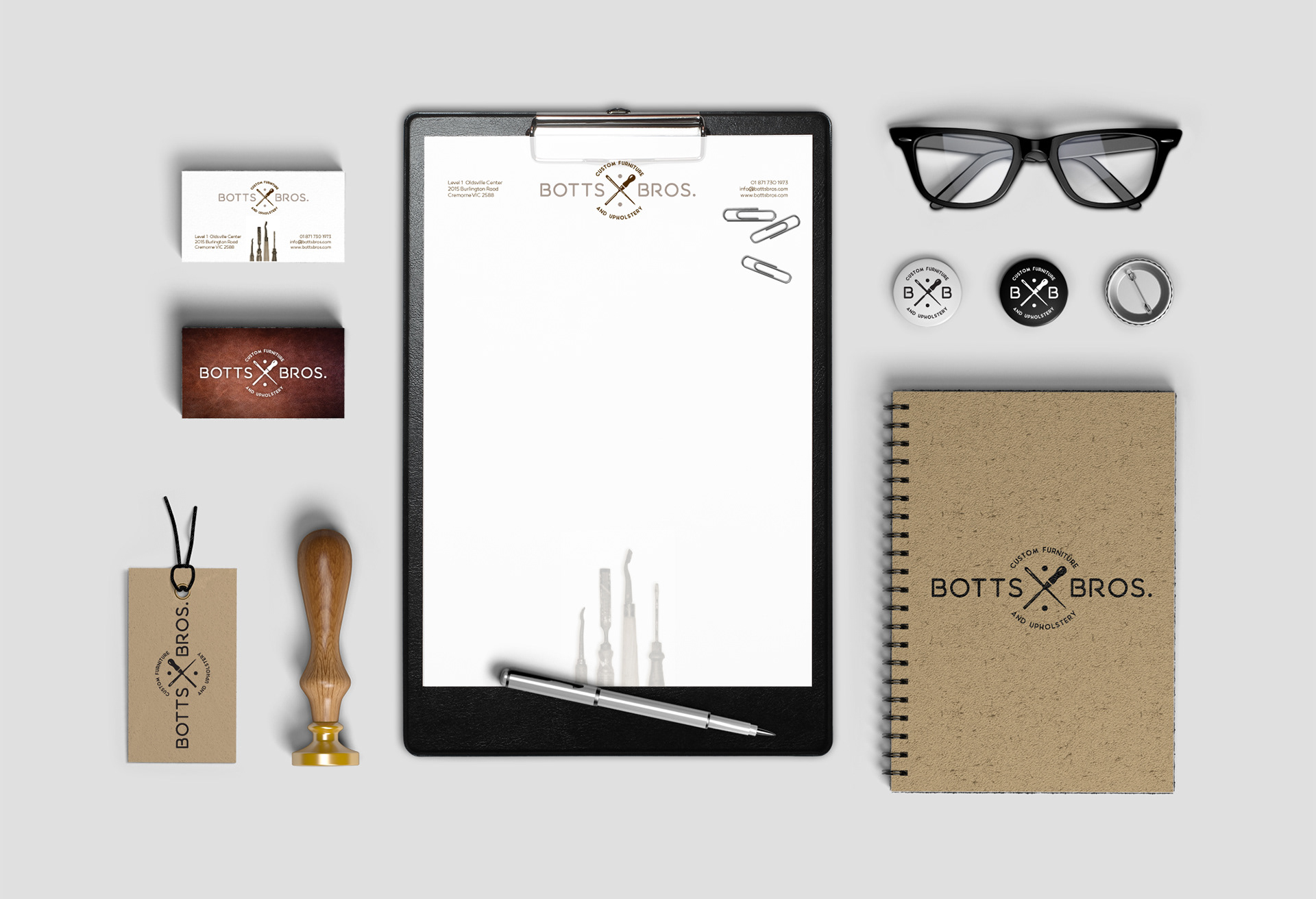 Botts Brothers is a custom furniture and upholstery company. The logo and stationary reflect the handcrafted aspect and quality of the products they offer. Classic and timeless, it evokes vintage materials and bygone days.