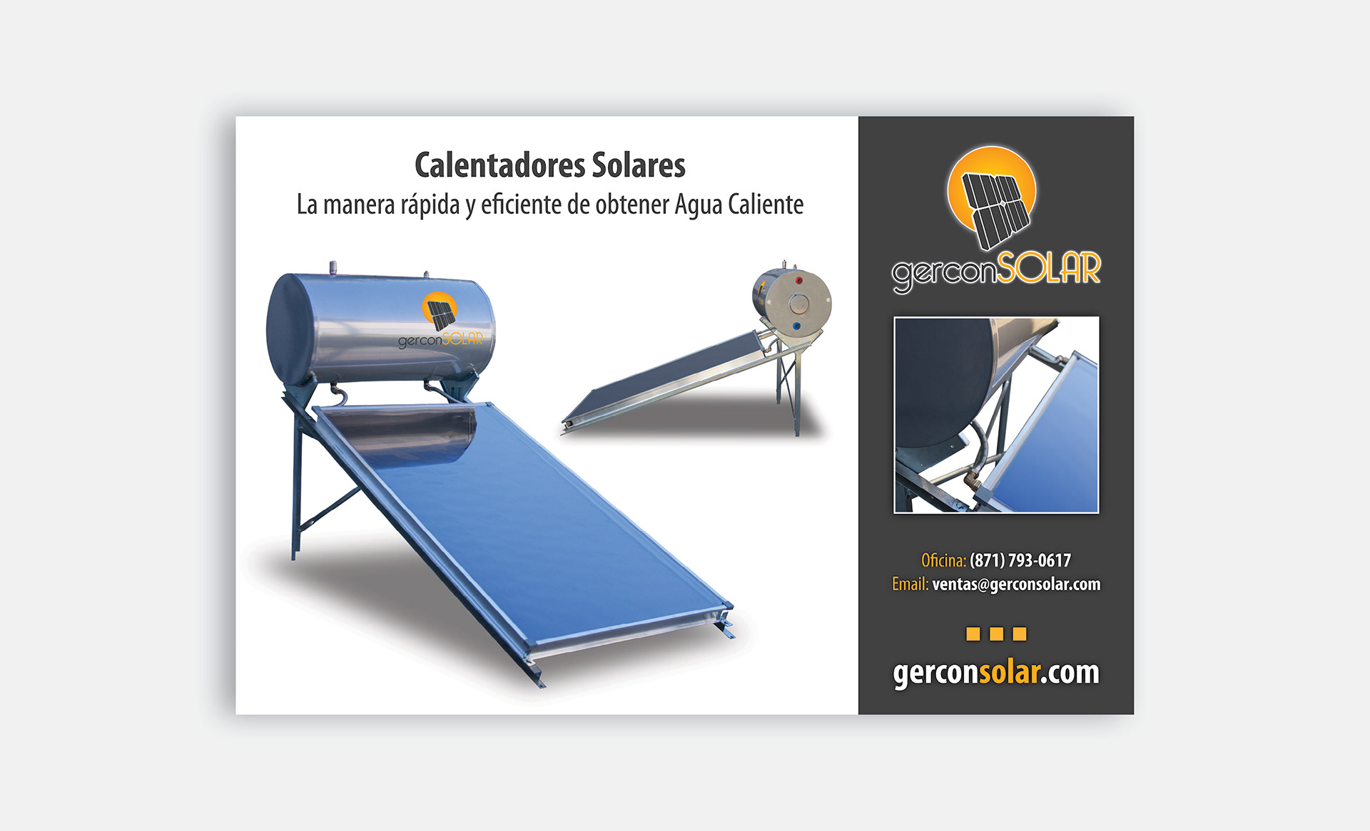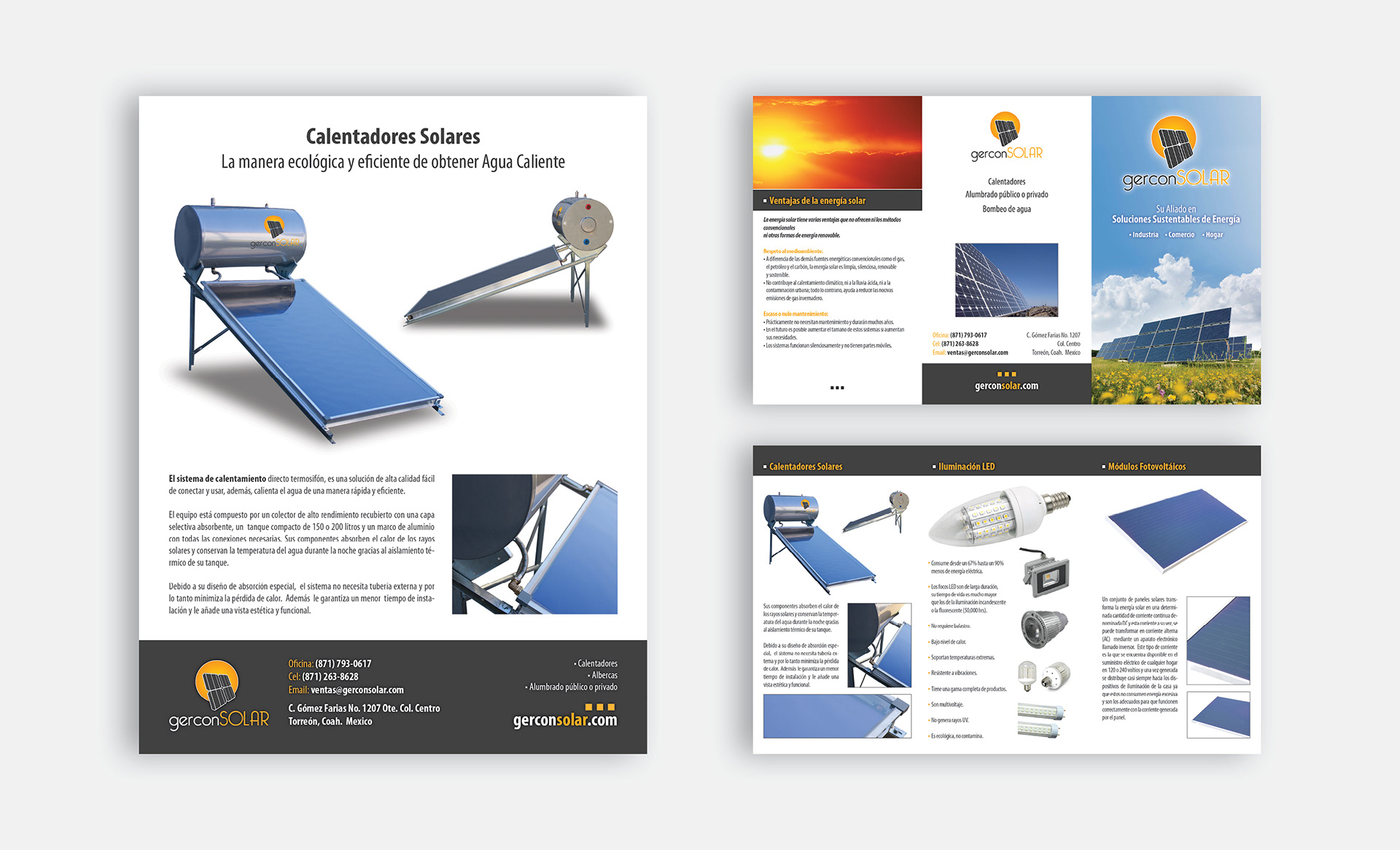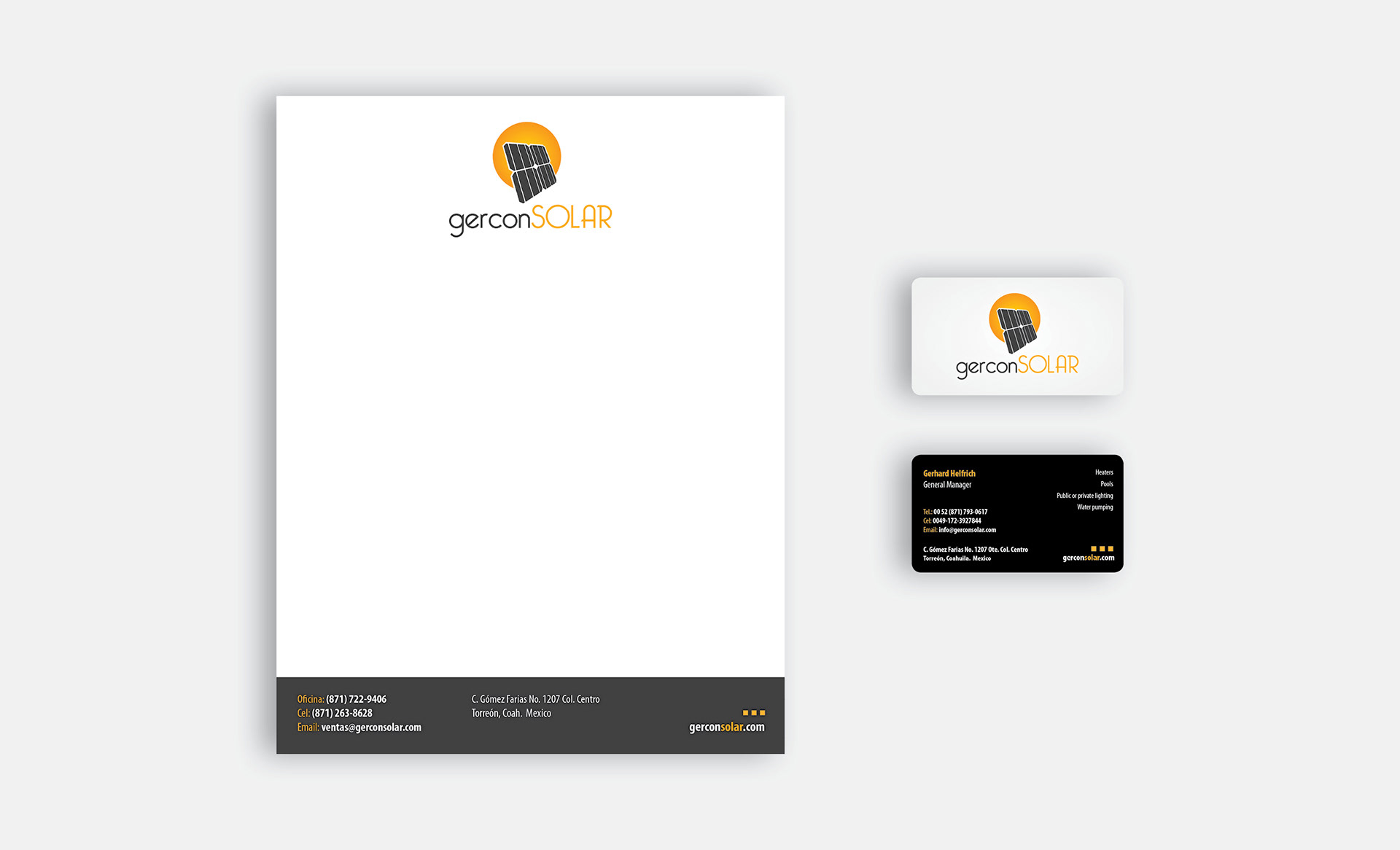 GERCON SOLAR offers solar energy saving solutions, like solar heated boilers, led lighting and solar cell cost efficiency solutions. The logo is pretty straighforward, a solar cell and the sun, making it clear what the business is about. The dark grey and the hues of orange play well once incorporated to the branding items.