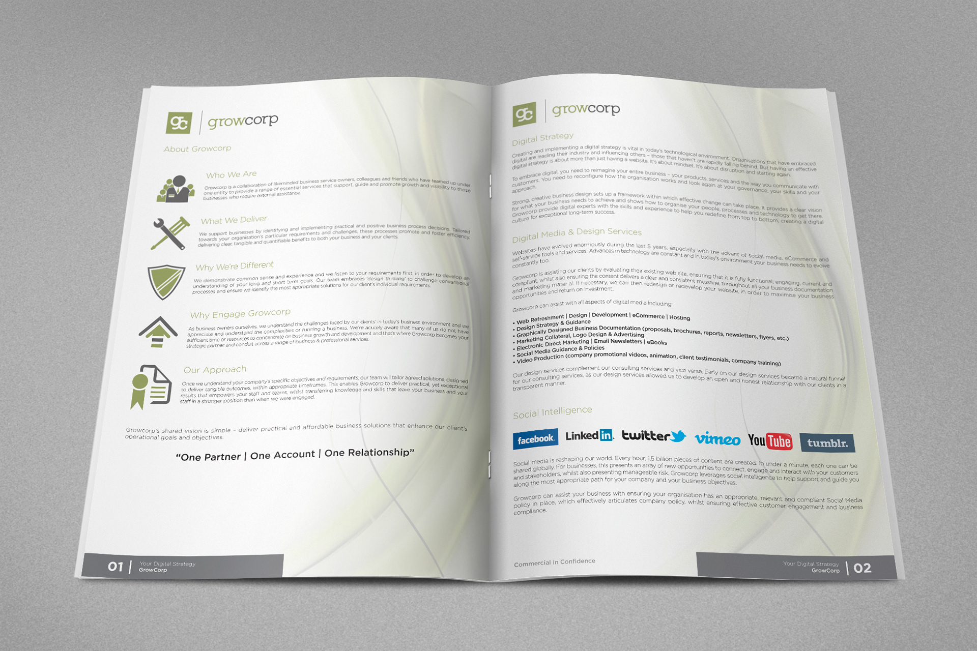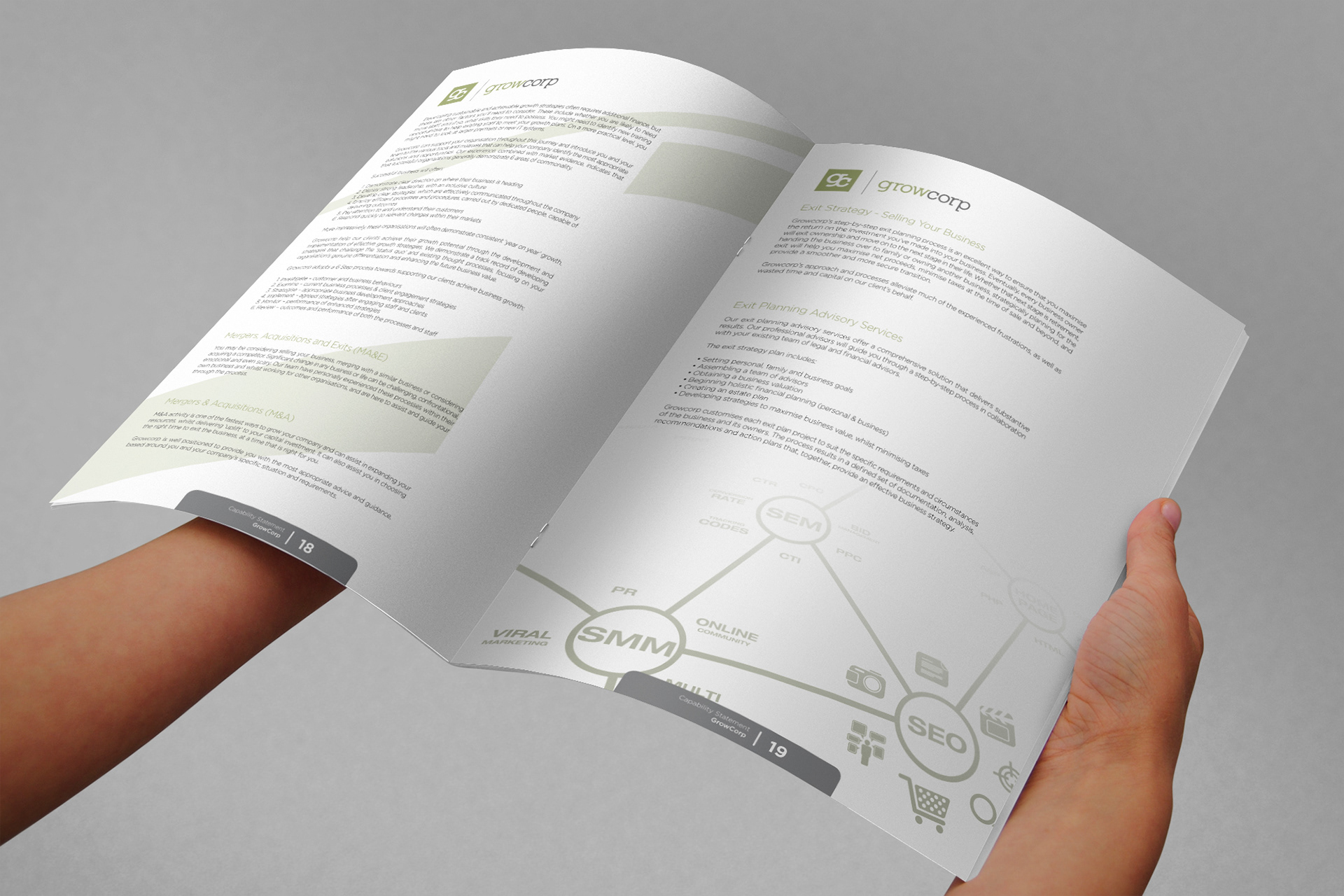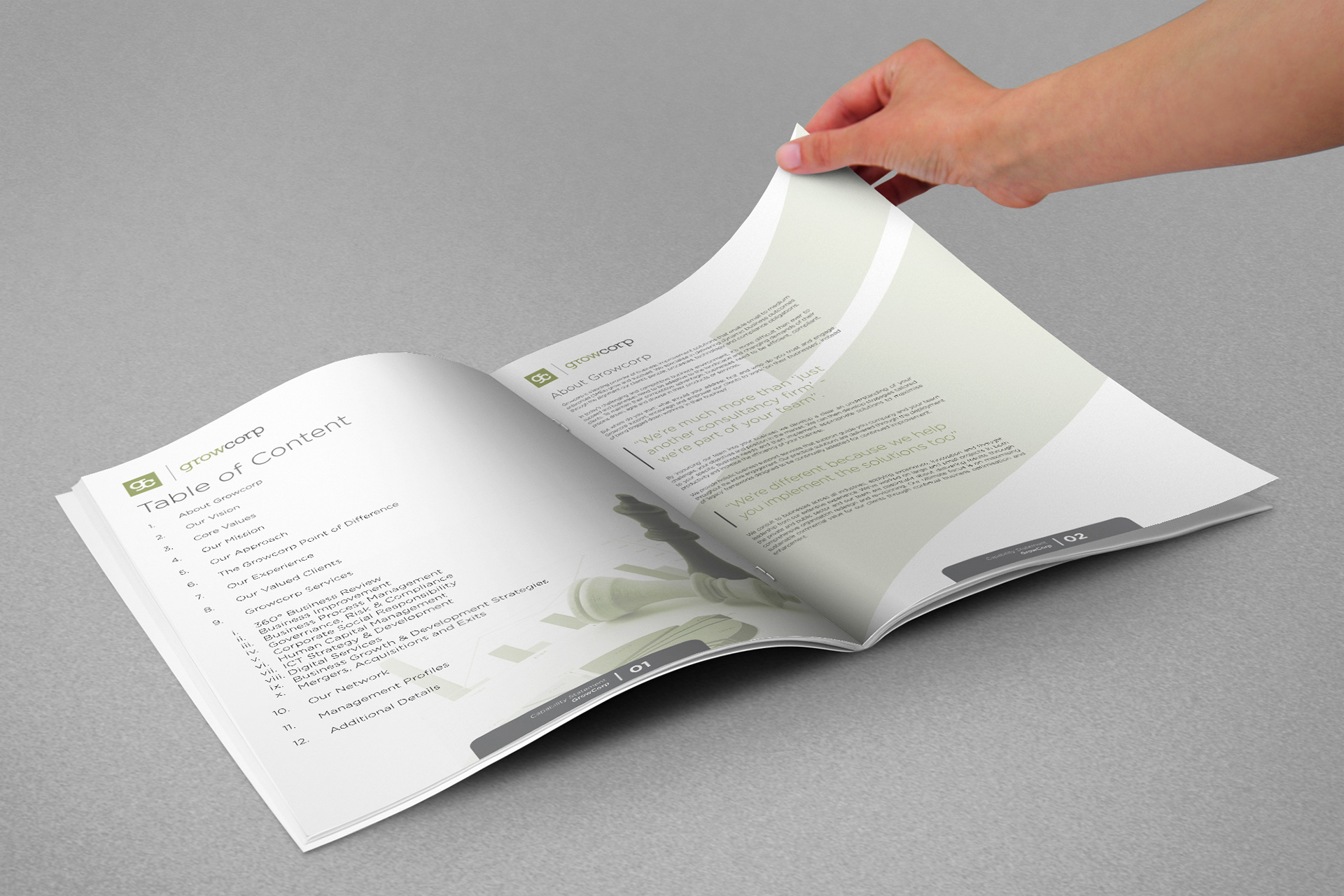Several editorial projects where developed for Growcorp, mainly corporate documents. The style varied between booklets but the color scheme of the brand is maintained.