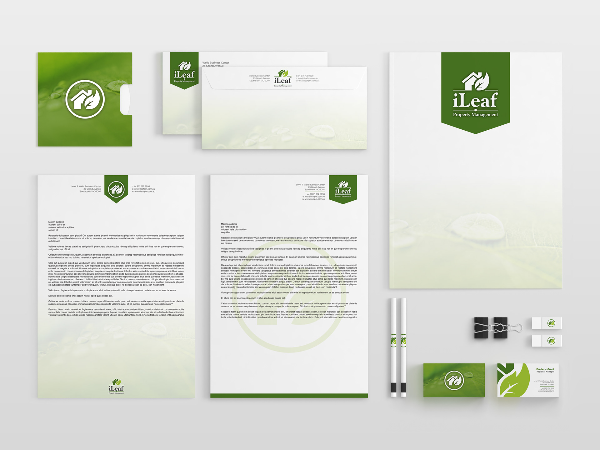 Logo and Stationary for iLeaf Property Management. The main graphical guideline was to have something related to a green leaf, something that could represent nature, growth and fullness of life.