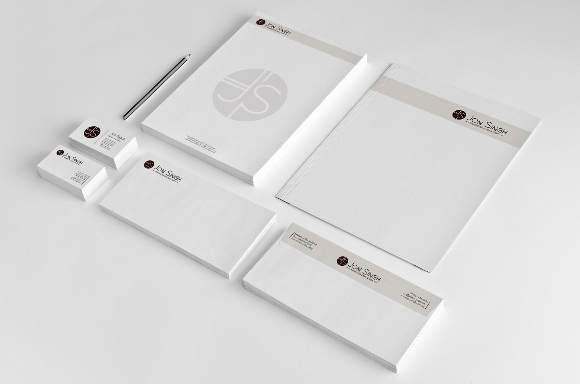 A very minimalistic, elegant and sober branding approach for a barrister and solicitor's office. Cleanness, simplicity and classy look uses warm color to create minor contrast.