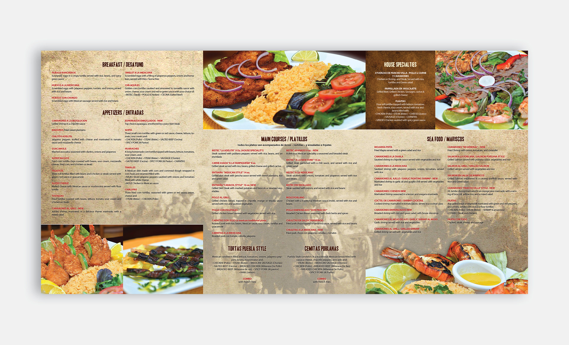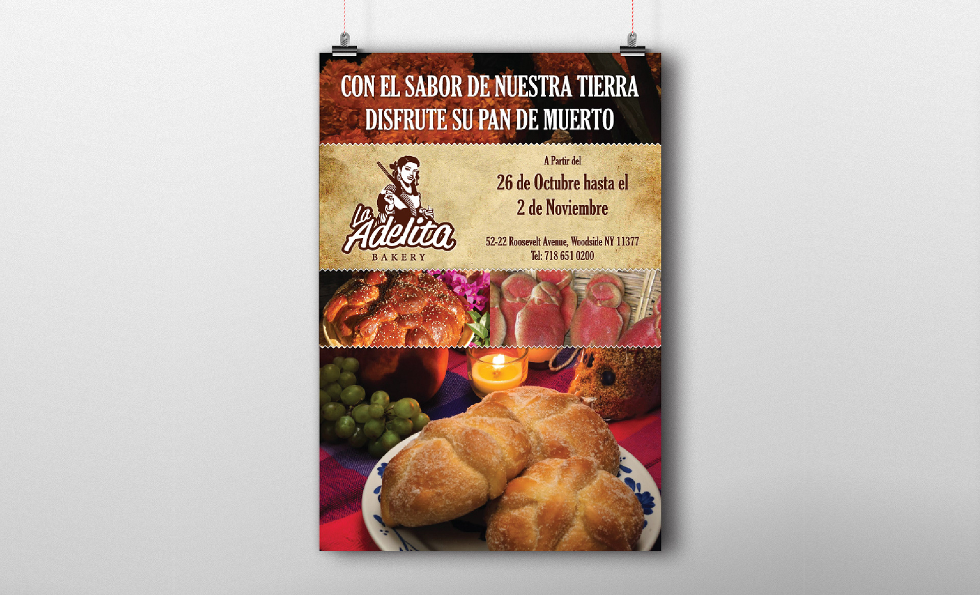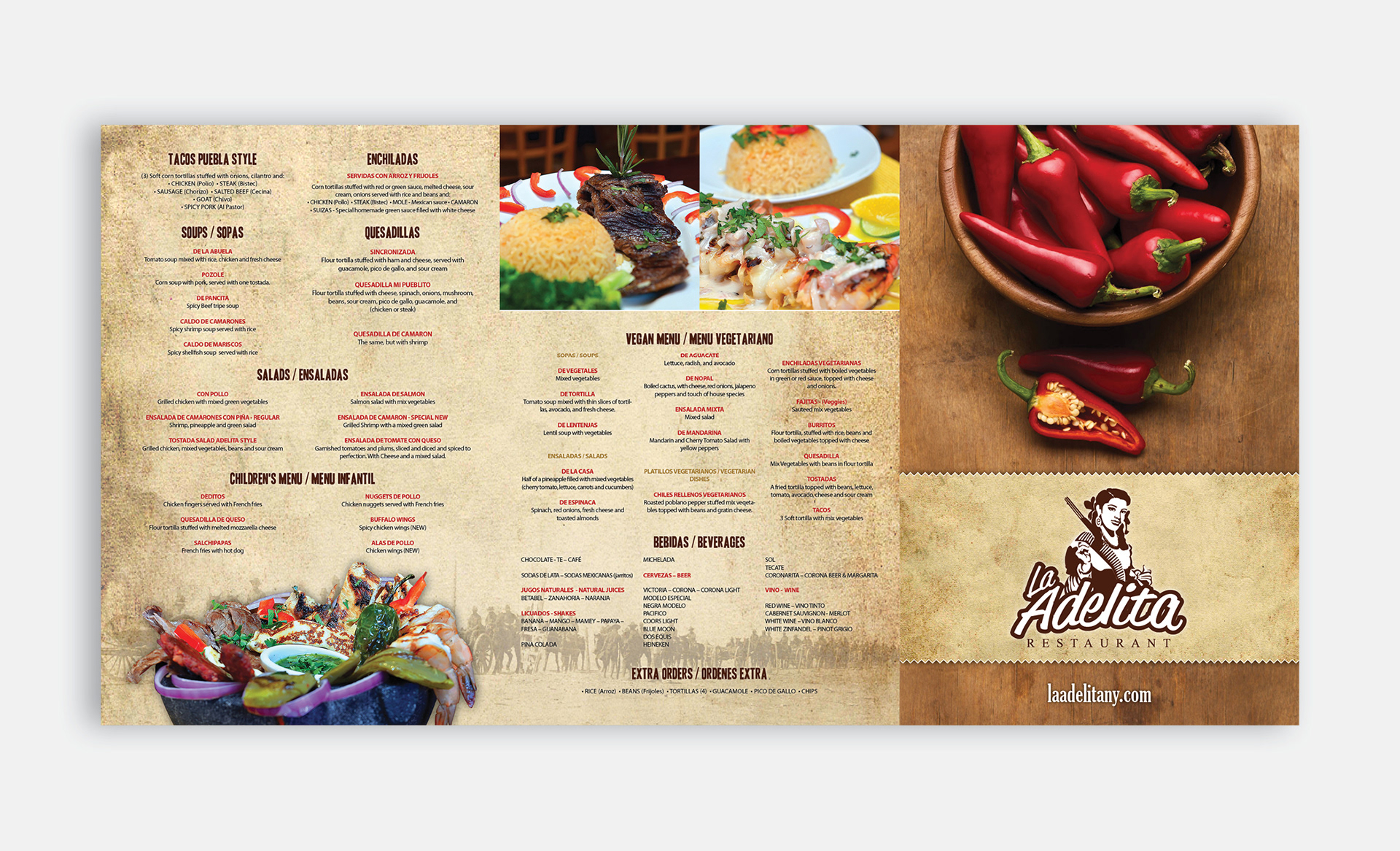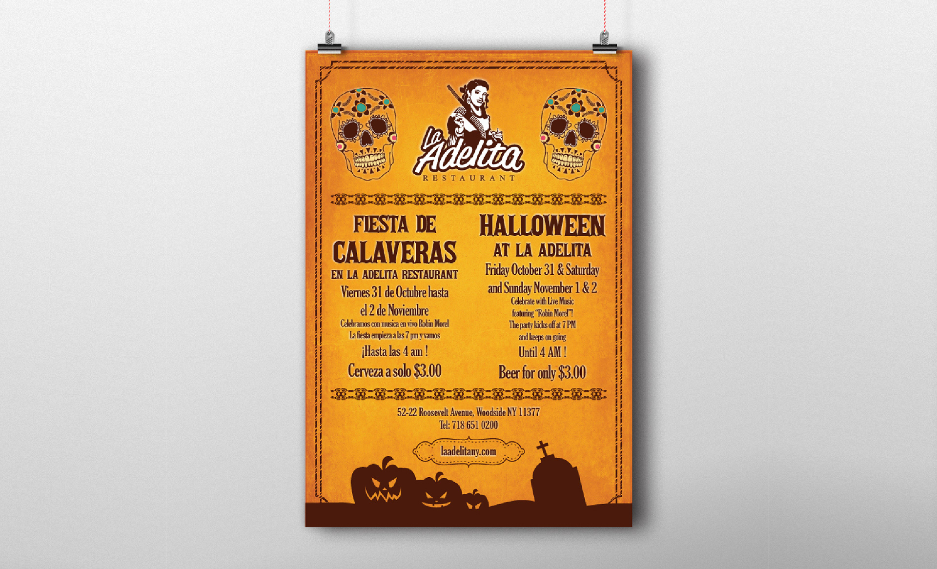 La Adelita is a Mexican Restaurant located in New York, that boasts a wide selection of tipical mexcian cuisine. The project consisted in redesigning the tabloid tri-fold menu and two promotional posters for October. Tipical Mexican images and textures were the main focus.