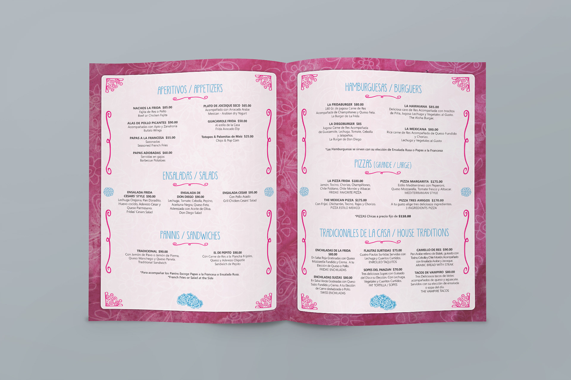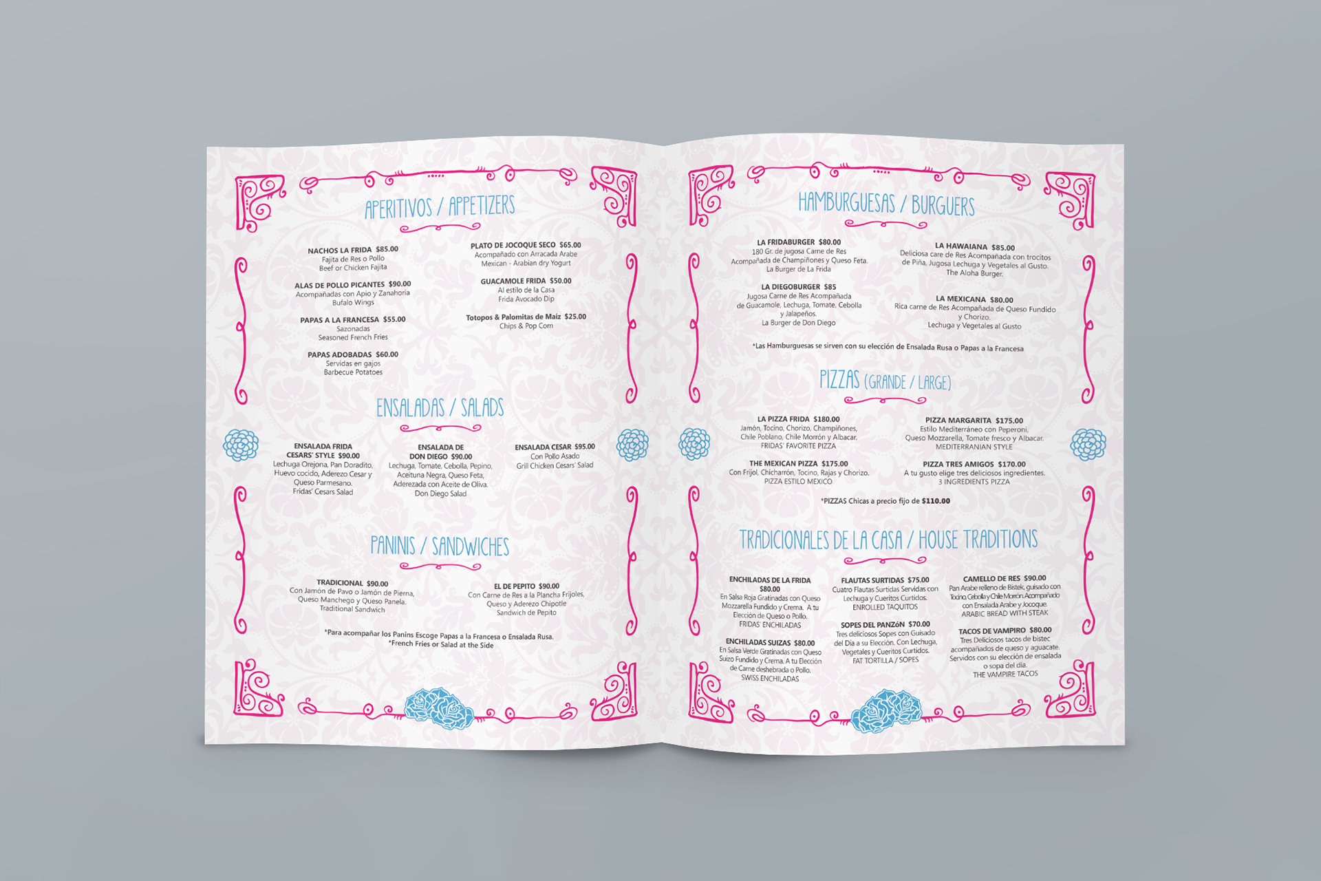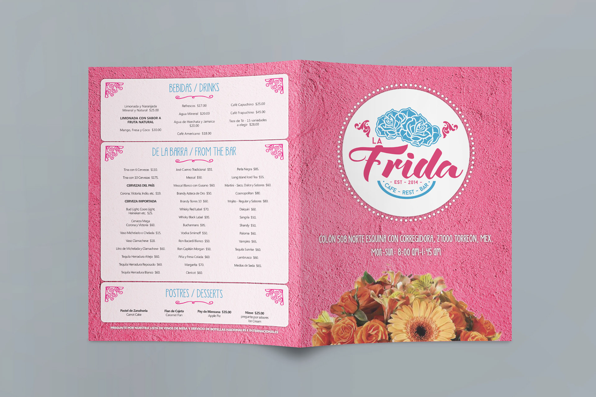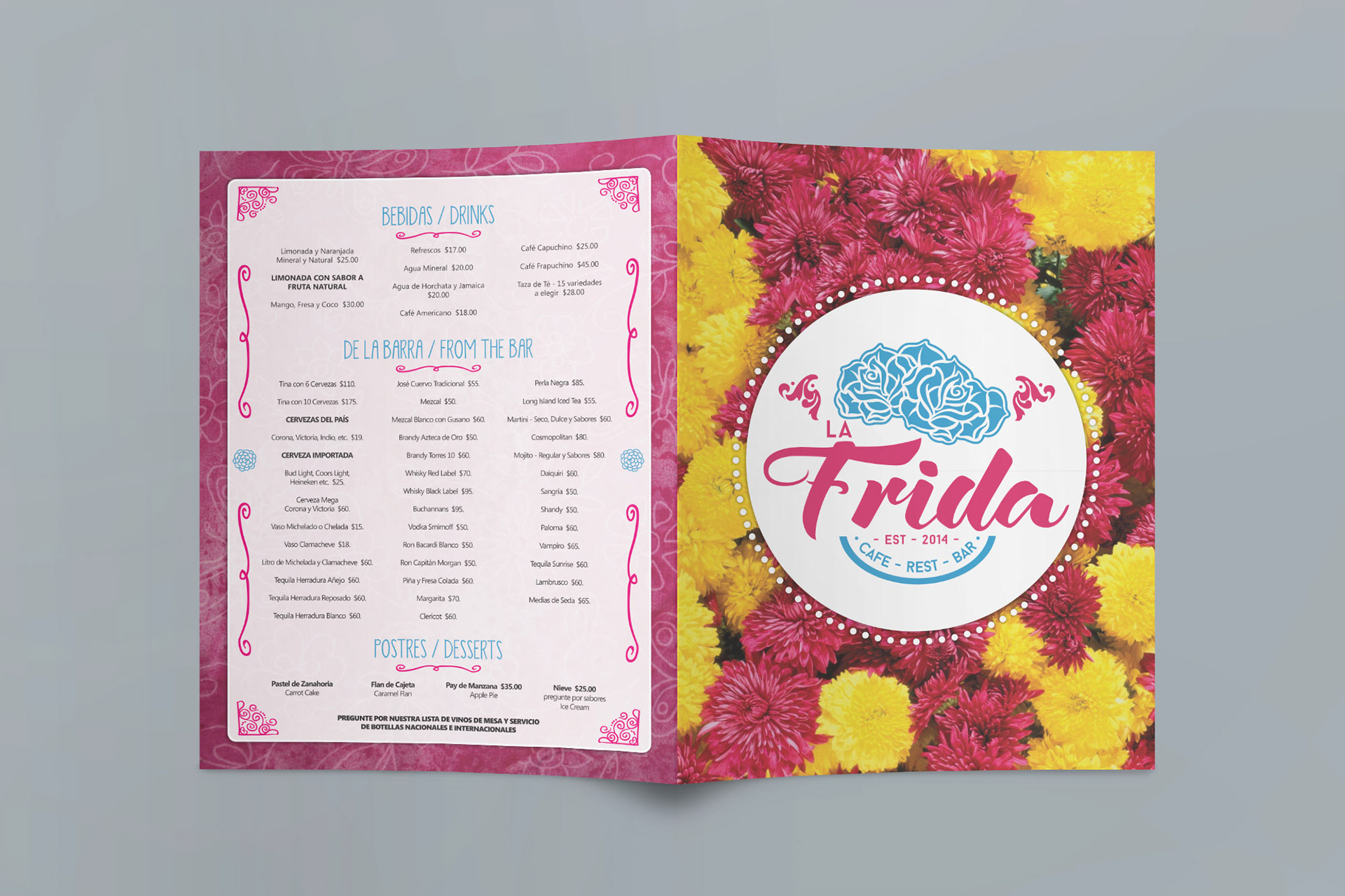 Although this particular project did not concretize at the end, I really like how the menus look. Taking a cue from the name and logo of the restaurant, the menus are based on typical Mexican pinks and flowers. Two versions of this concept were developed.