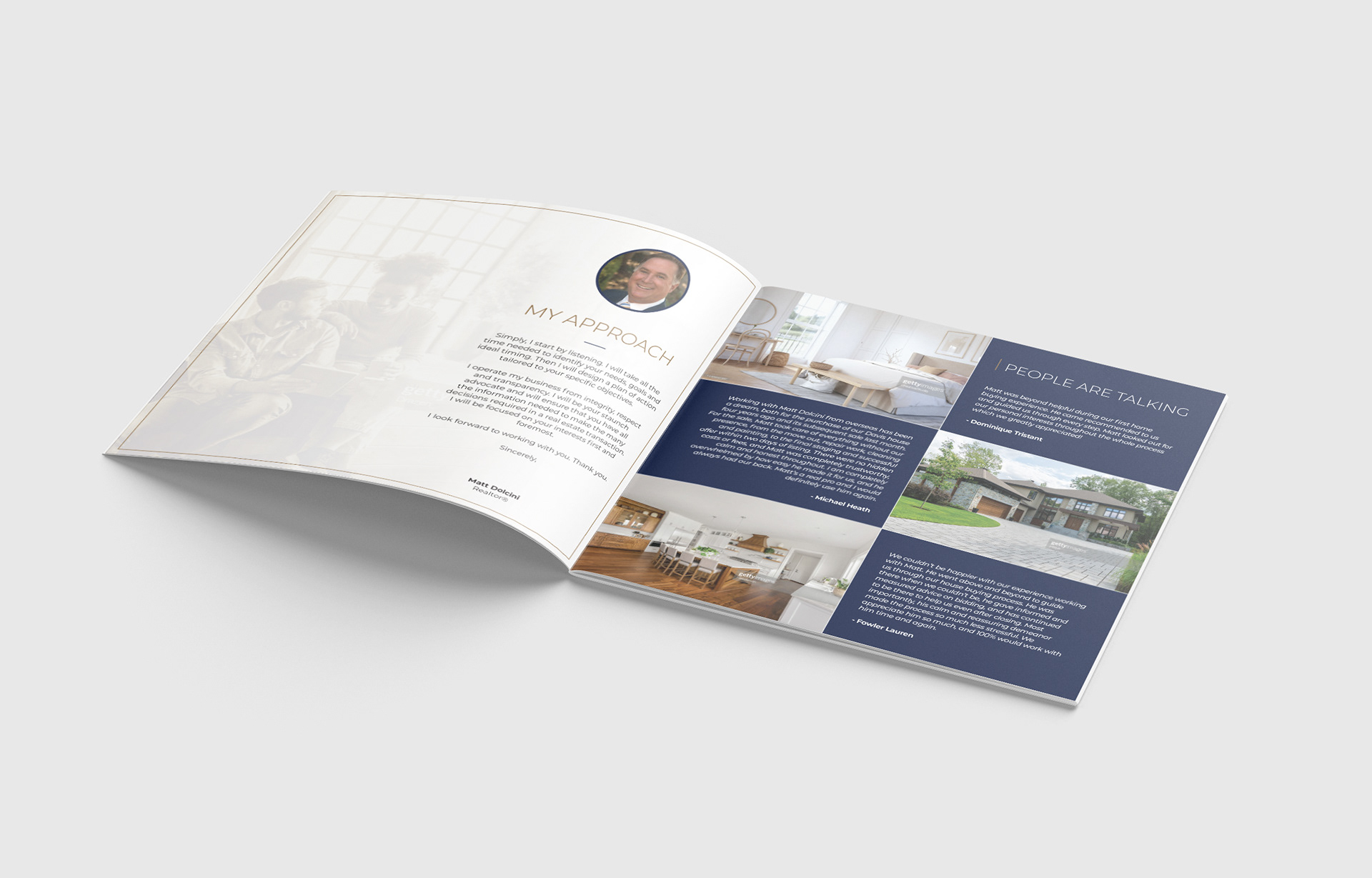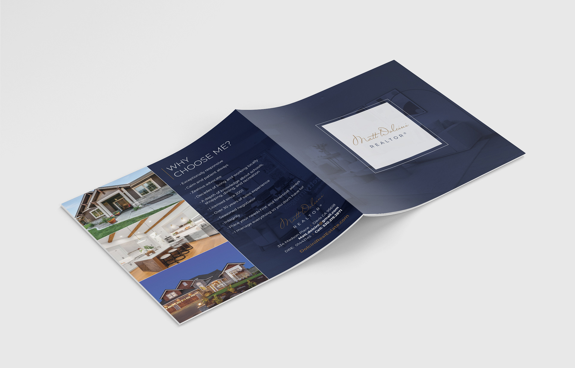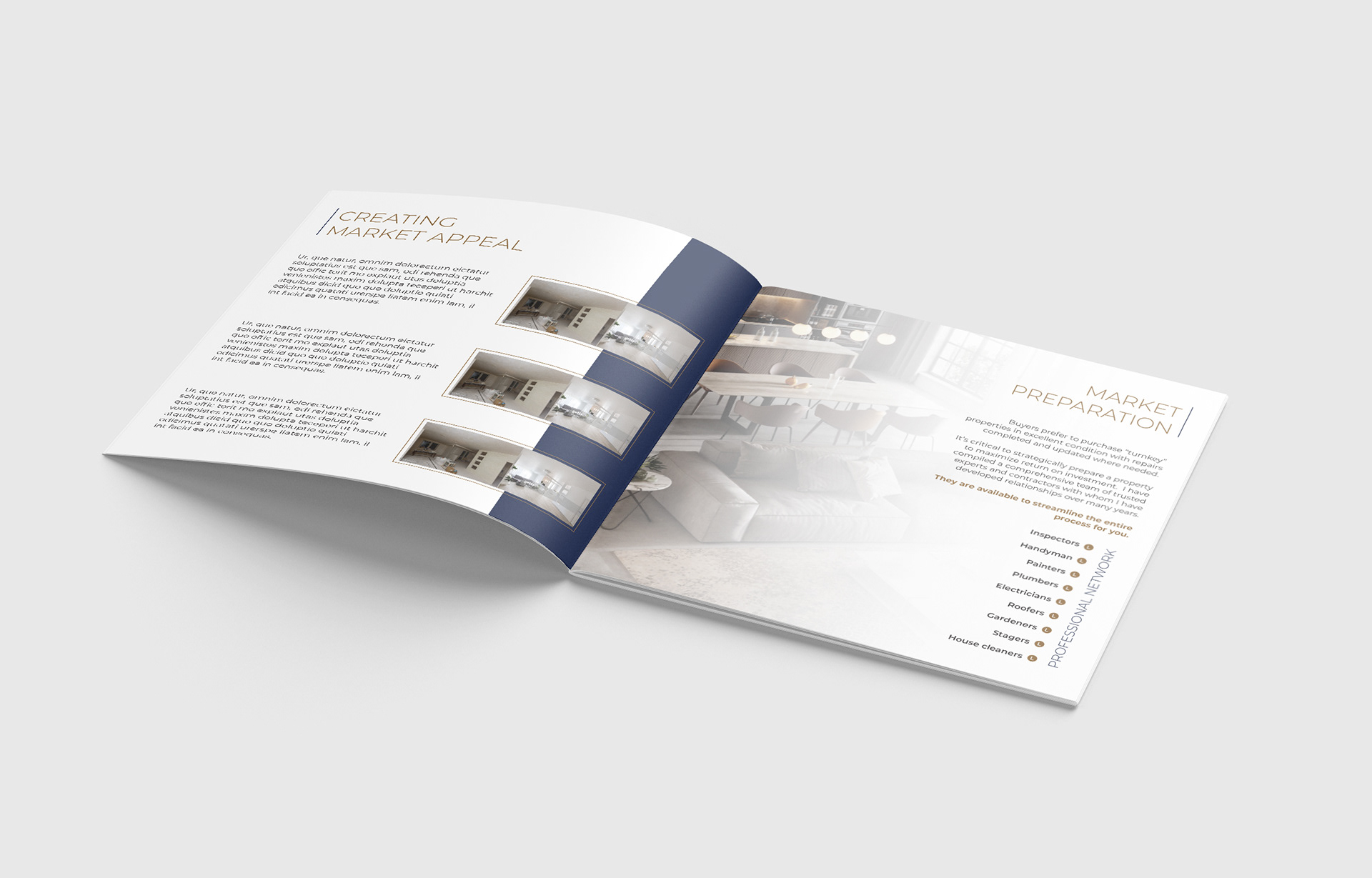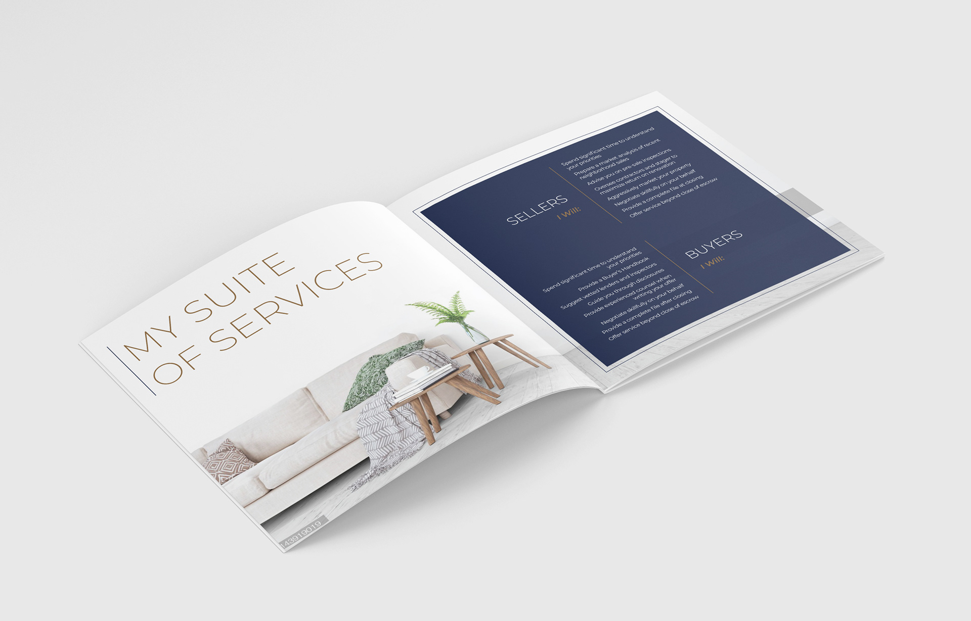 Brochure for real estate realtor services. Clean, minimal lines and shapes convey elegance and simplicity.