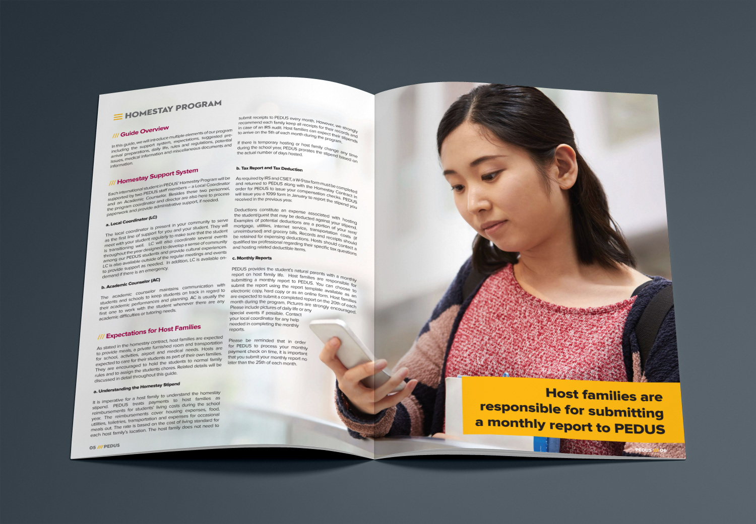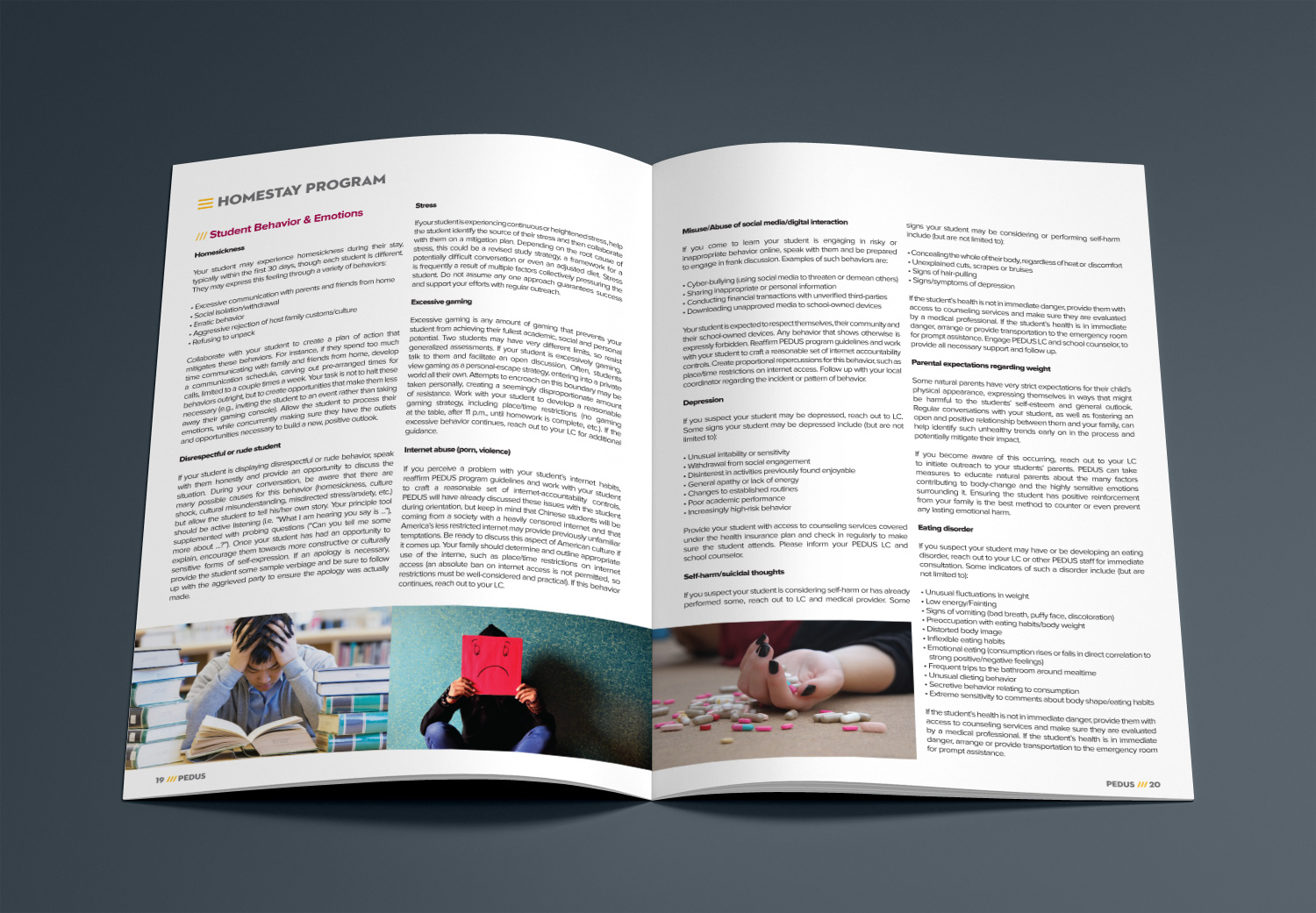 Booklet for Princeton Educational Services, containing all the pertinent info for the American host family of the Chinese exchange student. Eye catching and vibrant while maintaining ease of lecture.