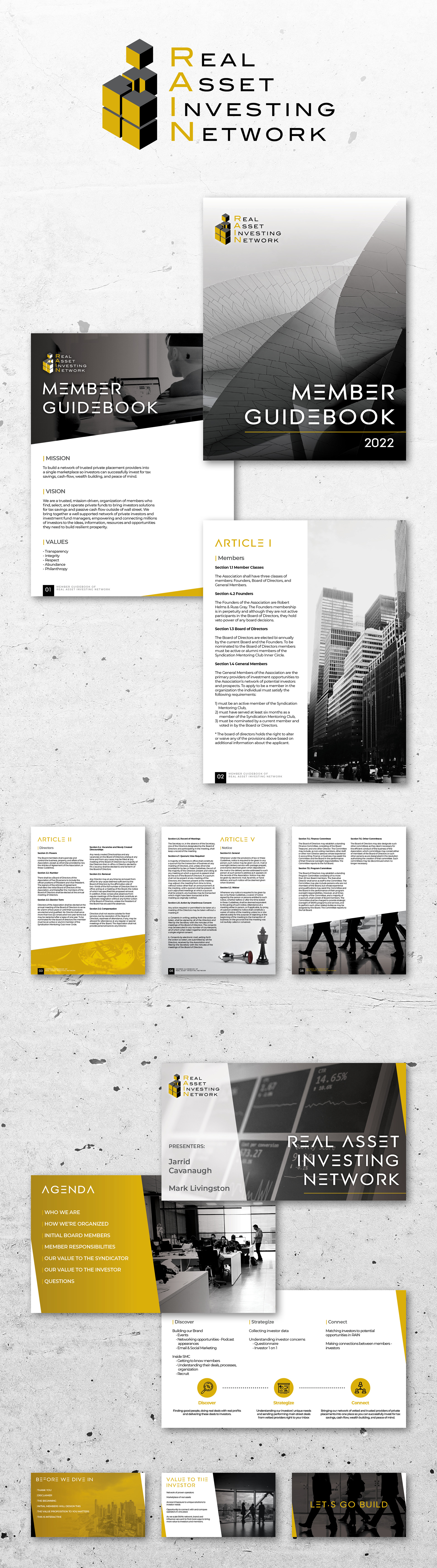 Logo design and marketing material for an Investment Company. Modern, abstract and corporate. The grays and the yellow make a sharp contrast that works well to demand attention.